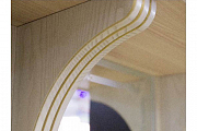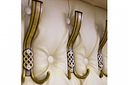 Фасады украшены декором с эффектом «патины», зеркало декорировано пескоструйным рисунком. Также использованы бронзовые крючки и фурнитура. Открывание дверей антресоли - газлифт. Мягкое сиденье и спинка выполнены из экокожи «Терра 101» с каретной стяжкой.