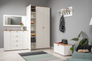 Вместительная шкафная группа позволит оптимально организовать хранение, а продуманные габариты тумбы, комода и зеркала дают возможность собрать различные компоновки.